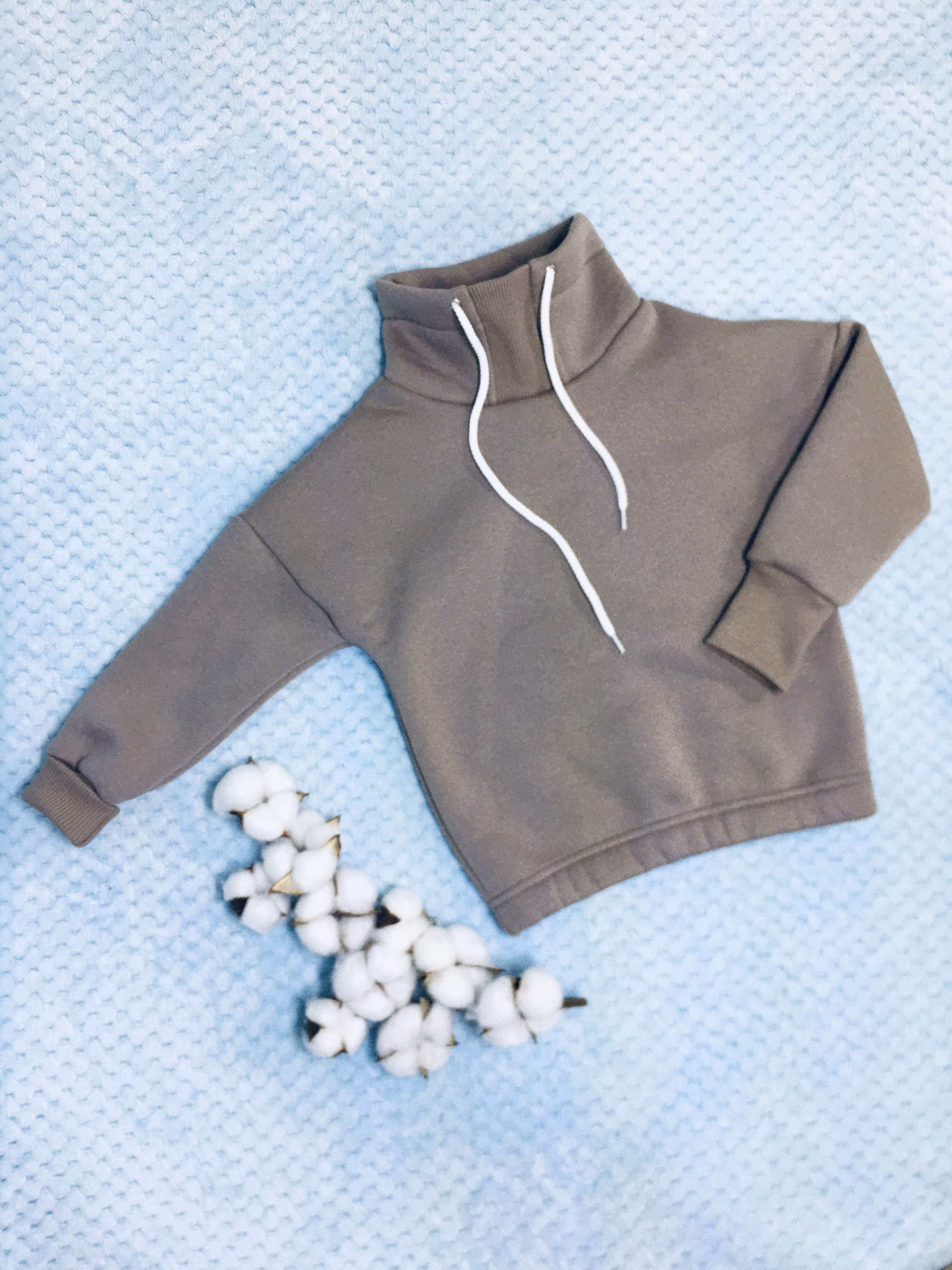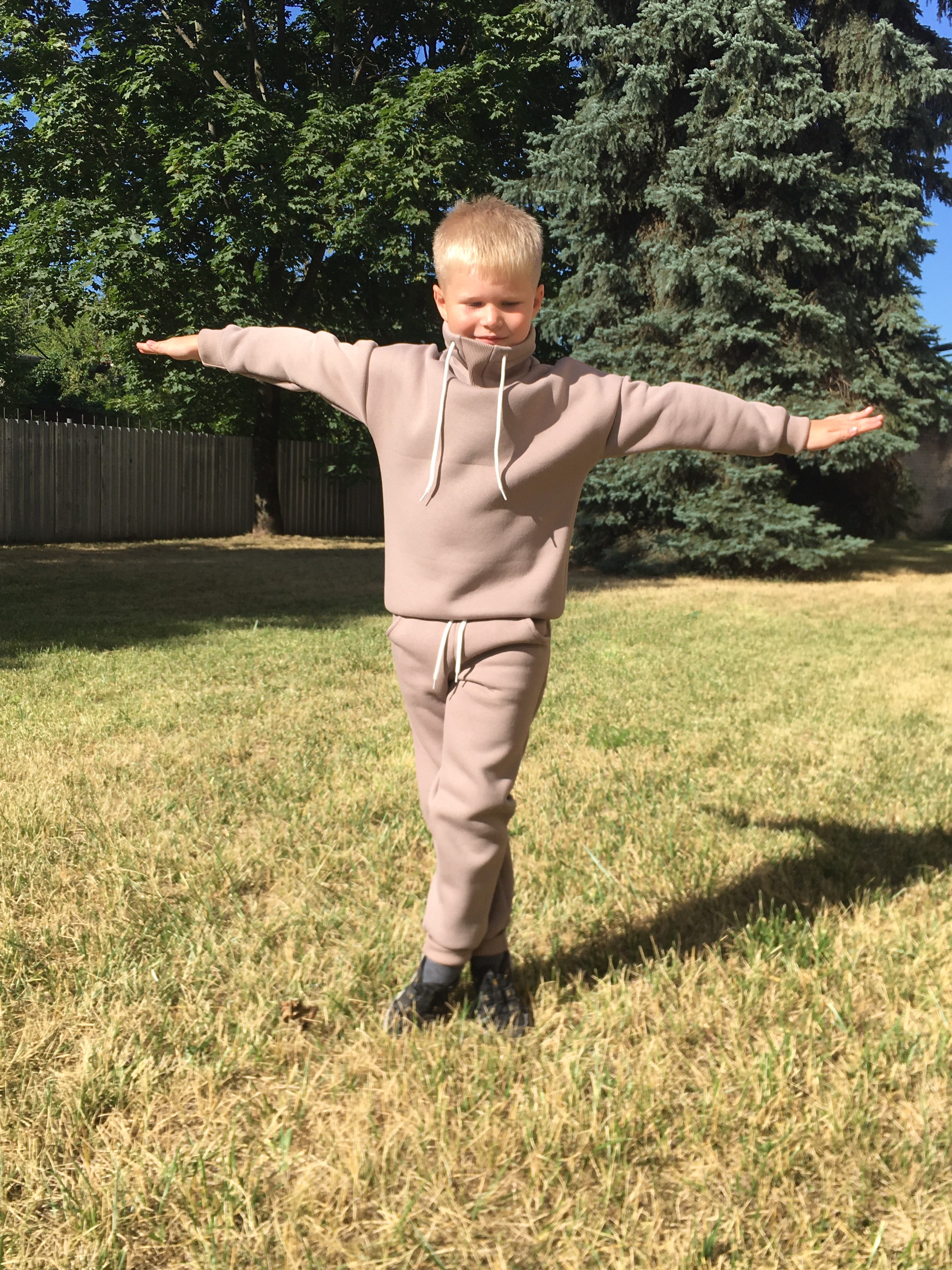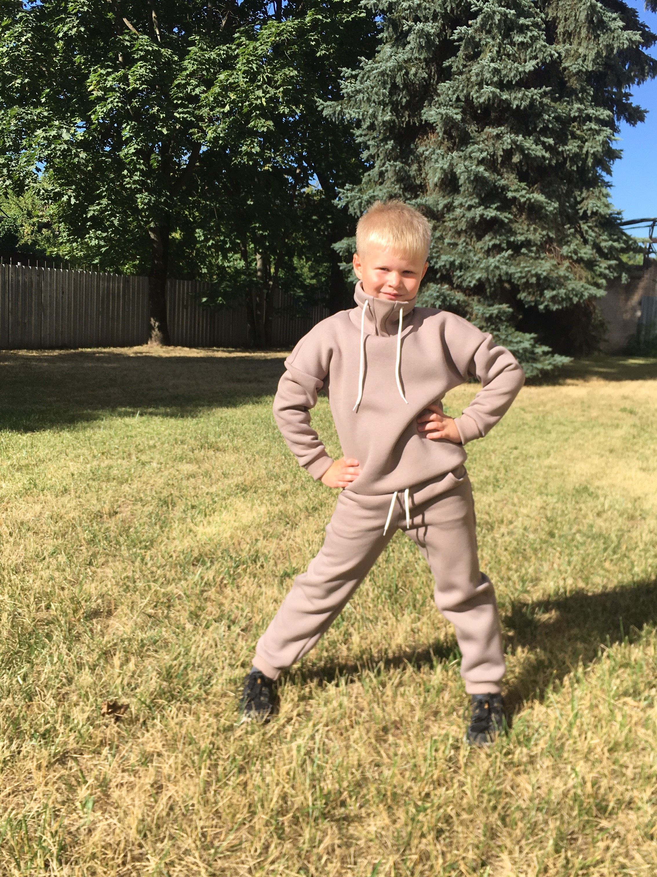Костюм выполнен из футера 3-хнитки с начёсом. Состоит из свитшота и брюк. Брюки сверху на широкой резинке и со шнурком, снизу на манжете с отворотом. Свитшот с воротником-стойкой, украшен шнурком, снизу вставлена резинка, рукава на манжетах с отворотом.